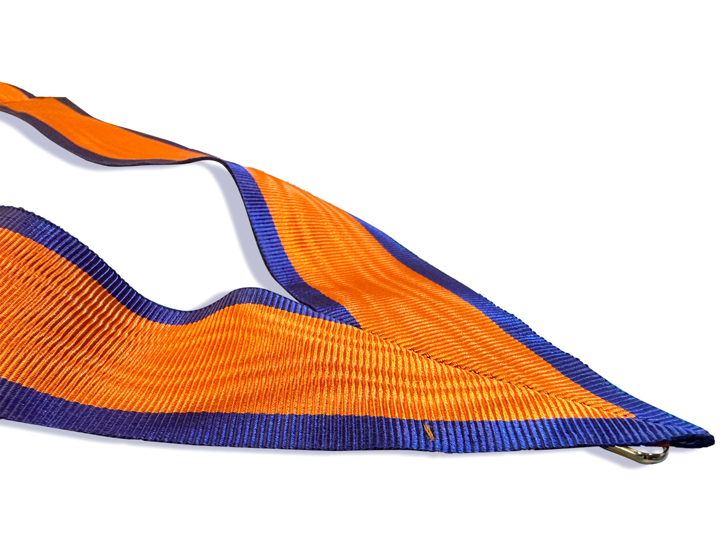 This is the Allied Masonic Degree Worshipful Masters Collarette, made with extra care and effort. The collarette is made with high quality blue and orange moire ribbon. It features a swivel hook at the bottom of the V-neck designed collarette so you can easily attach a collarette jewel of your choice.The piece is lightweight and uses a Velcro fastener so it will be easy to wear for long periods of time.