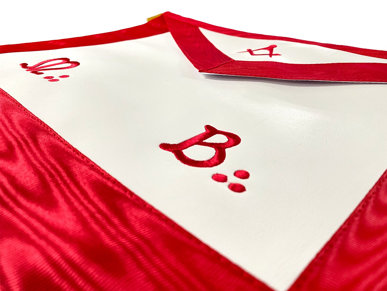 Ancient Accepted Scottish Rite Master Masons MB Apron with Sq & Compass, machine embroidered design on a superior imitation leather or Lambskin front. Apron has an adjustable waistband with a pocket to the back, Red moire effect ribbon to the front.