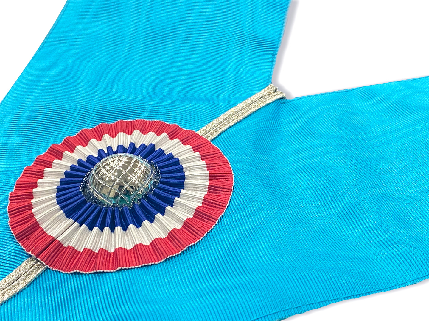 This stunning Grande Loge Nationale Française Officer Collar with its beautiful blue moiré material with an inner lining for a comfort fit is a perfect gift for either yourself or your fellow brothers. The eye catcher of the piece is the vibrant tricoloured rosette with a silver ball in the centre that reflects the light and steals eyes from across the room and has a detailed braided silver stripe flowing through it. The collar is manufactured to the finest quality with neat tight stitching all round.