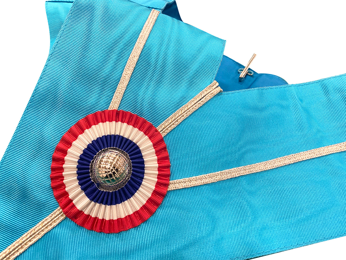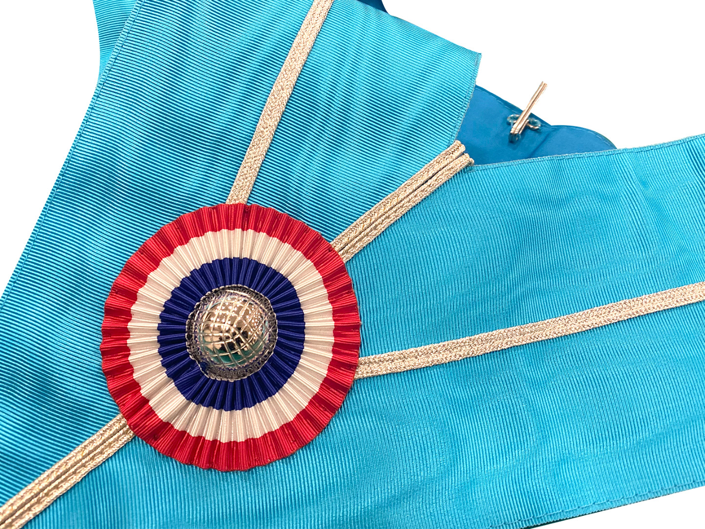This stunning Grande Loge Nationale Française Past Masters Collar with its beautiful blue moiré material with an inner lining for a comfort fit is a perfect gift for either yourself or your fellow brothers. The eye catcher of the piece is the vibrant tricoloured rosette with a silver ball in the centre that reflects the light and steals eyes from across the room and has a detailed braided silver stripe flowing through the collar. The collar is manufactured to the finest quality with neat tight stitching all round.