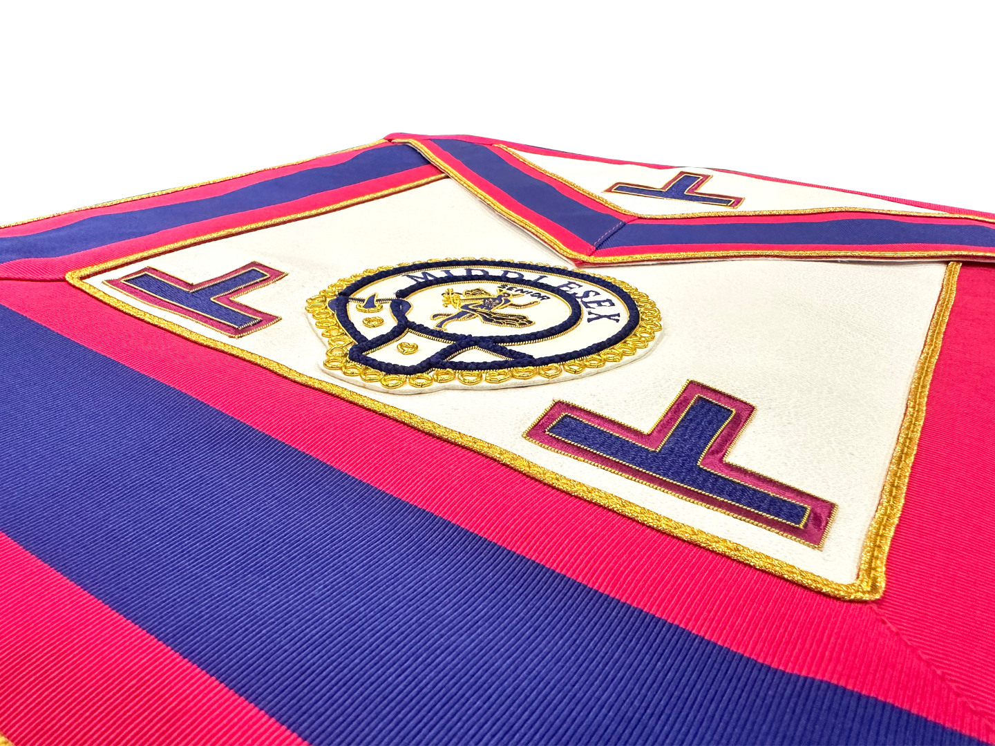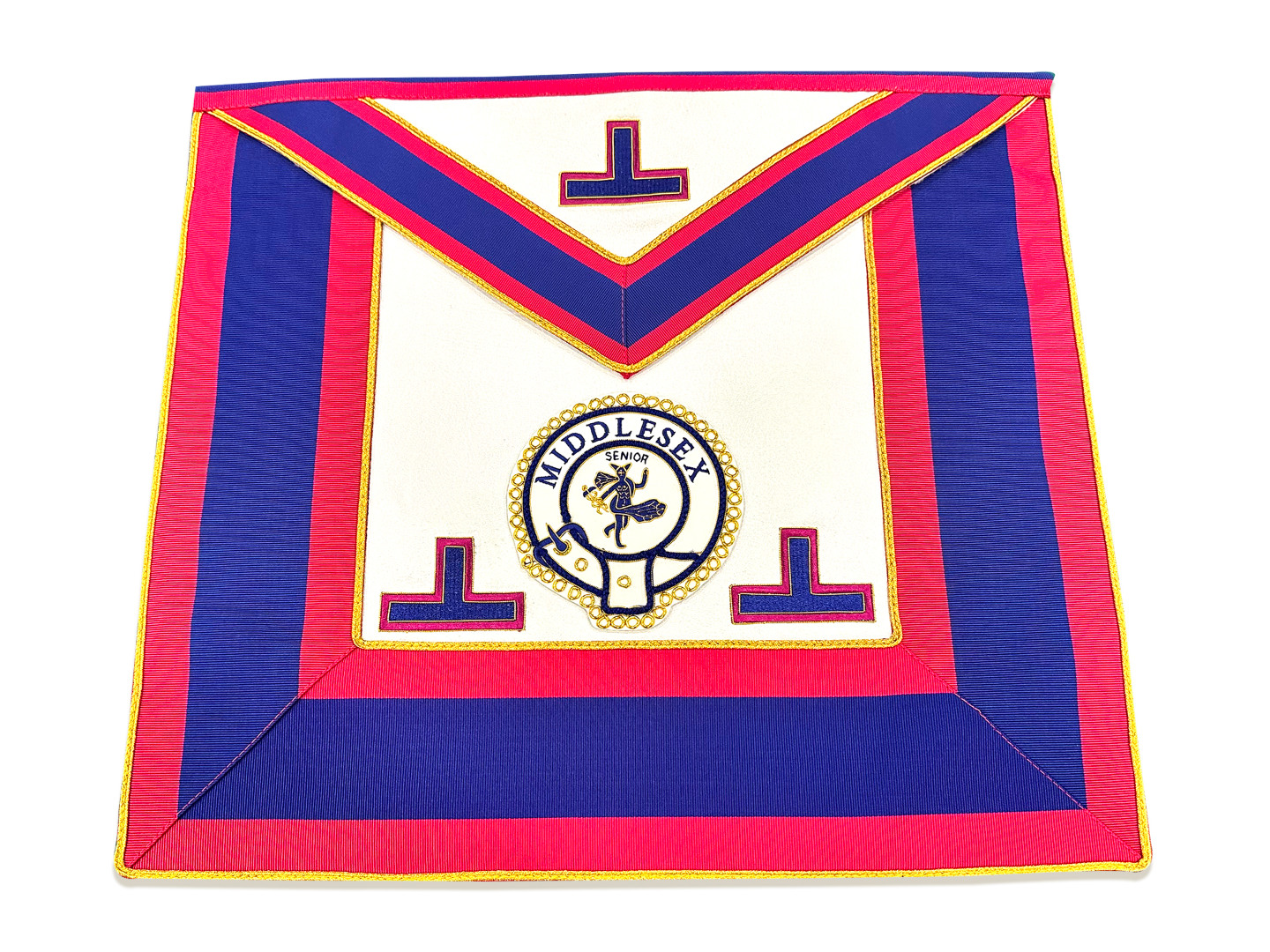 This is a duo consisting of a mark provincial undress apron badge sewn onto a spotless, matching lambskin apron. The apron badge and apron are both hand embroidered with gold bullion wire and blue thread. The apron uses a lovely blend of colours to create an appealing look and match the mark degree colour motif. The apron has a large pocket to the back for all your mints and an adjustable belt, with gilt plated belt fittings. The badge is made to order with your province and rank in mind; the badge has your rank ensign in the centre and your province around the edge.