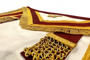 This is the Order of Athelstan Past Masters Apron. An excellent piece of regalia made of high standard imitation leather, or superior lambskin depending on your choice. The apron is handmade with dark red ribbon, the afore mentioned white leather and silver polished chain tassels. The apron features..