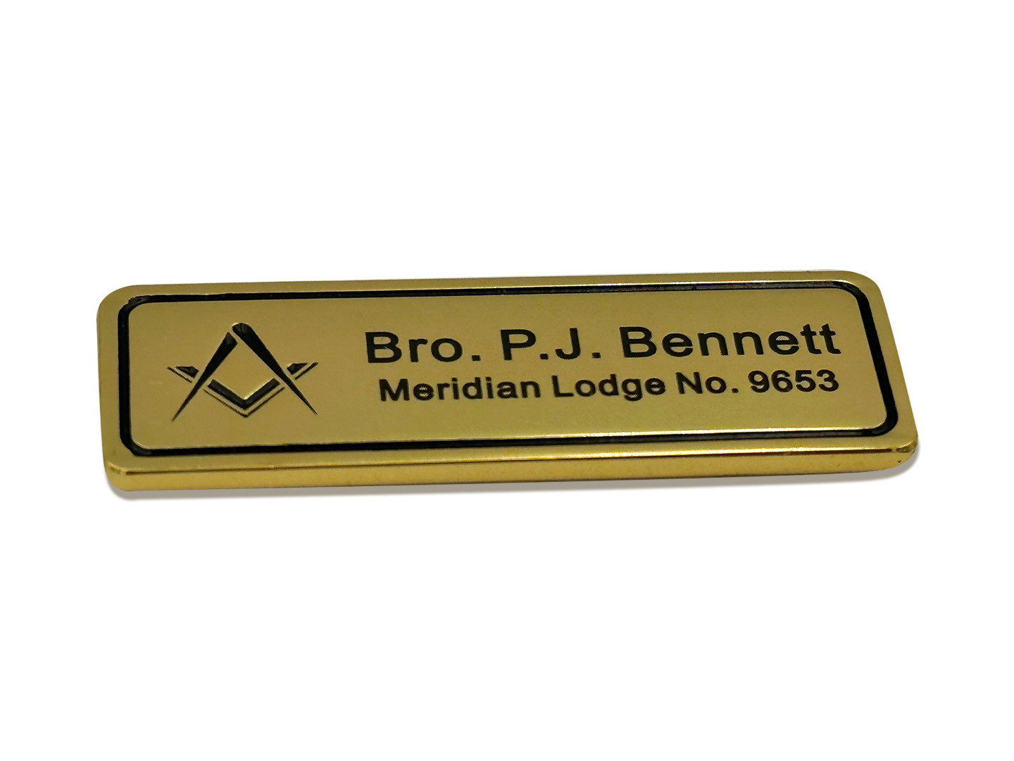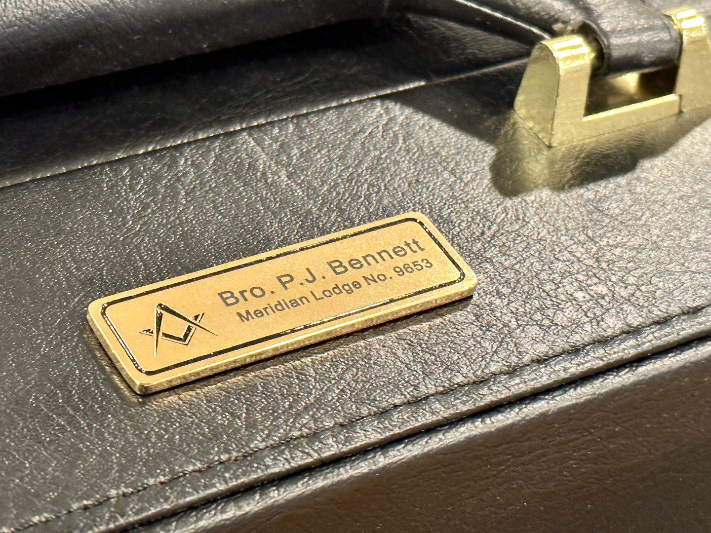 We provide you with a finely polished, gold plated and embossed Name Plate for your regalia brief cases or soft cases. The gold plating & black enamel brilliantly contrasts with the black of your briefcase yet also complimenting the gold fittings on the case's handle and locks. The name plate will be engraved with your requested details (Being Lodge Name, Number, your name or any other preference) along with a square and compass and decorative border. Unlike some other substandard name plates this is 2mm thick high quality brass with wording laser cut and then neatly colour filled with black enamel. The plate will be supplied with a 3M peel off self-adhesive back for ease of use giving a firm lasting hold.