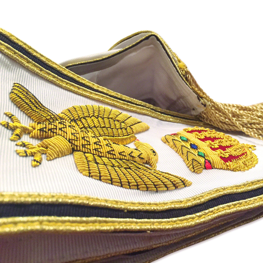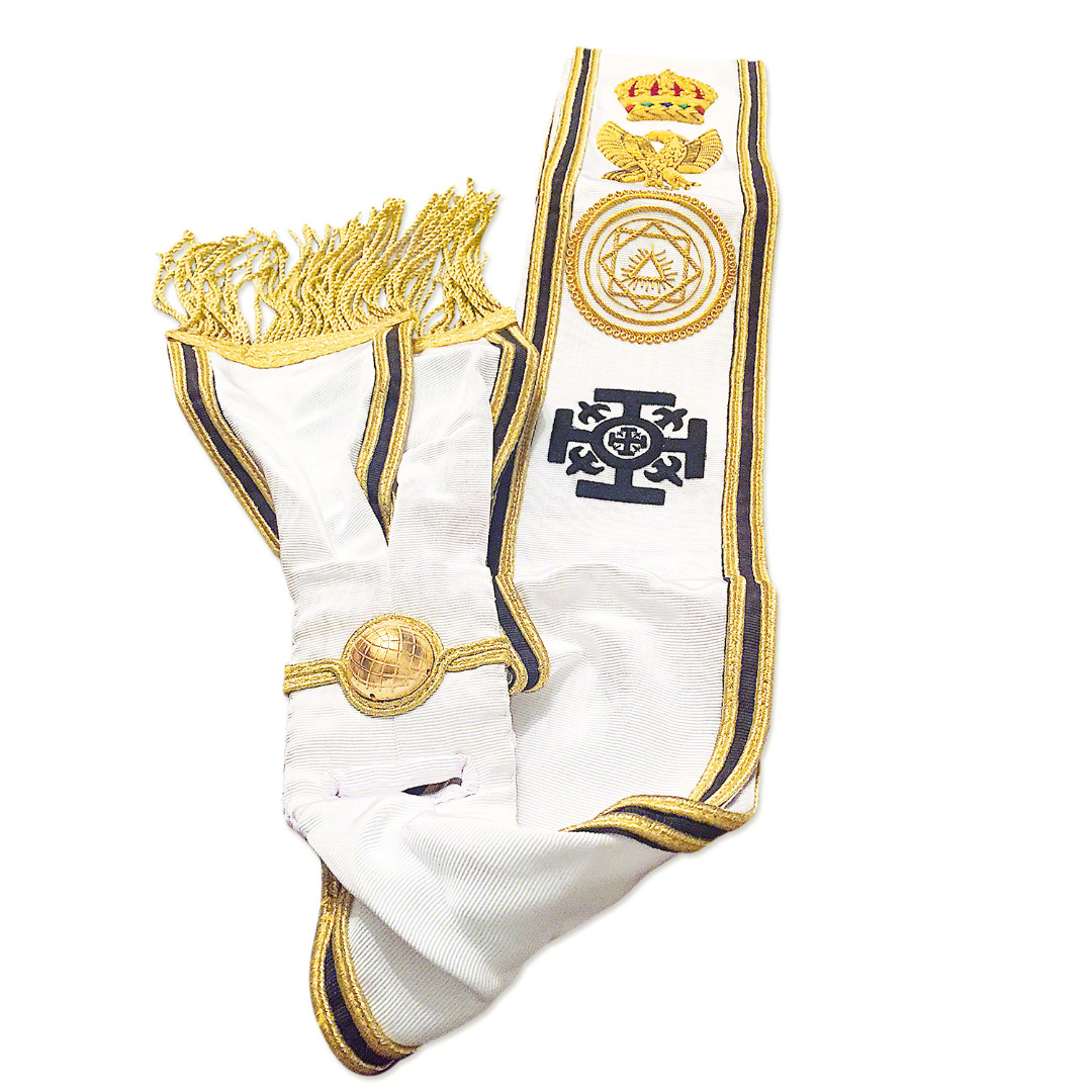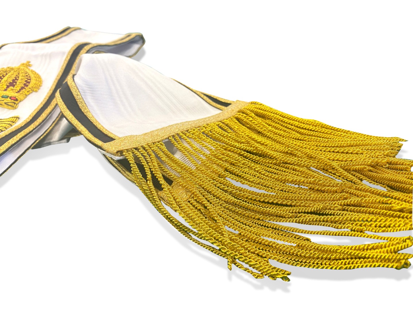 The Red Cross of Constantine Divisional Intendant General Sash is made with the finest quality fabric. You can wear this beautifully designed masonic sash with your attire and attend lodge ceremonies and meetings. This masonic sash is black, gold and white with a subtle moiré pattern. Red Cross of Constantine emblems are beautifully embroidered on a side of this product with your division's name hand embroidered above the emblems. The sash will be hand-embroidered so your will need to order in advance with production taking 18-24 working days.