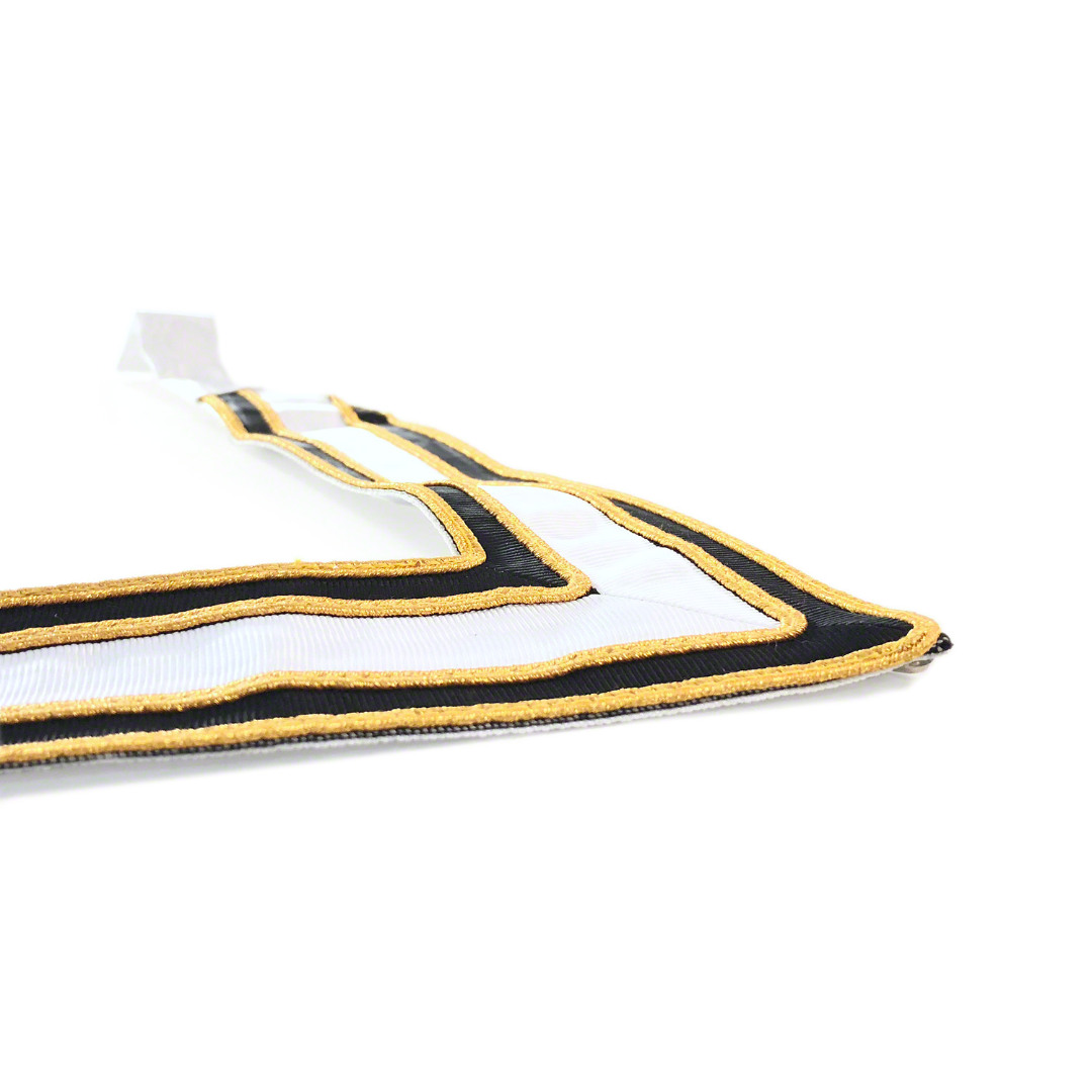 Masonic Collection Limited brings you this finely made collarette with Freemason values in mind. This elegant collarette is sure to amaze you or the mason you are gifting to. The design features a dark red & white moiré pattern and sleek, gold piping on the edges of the piece and between the colours.
