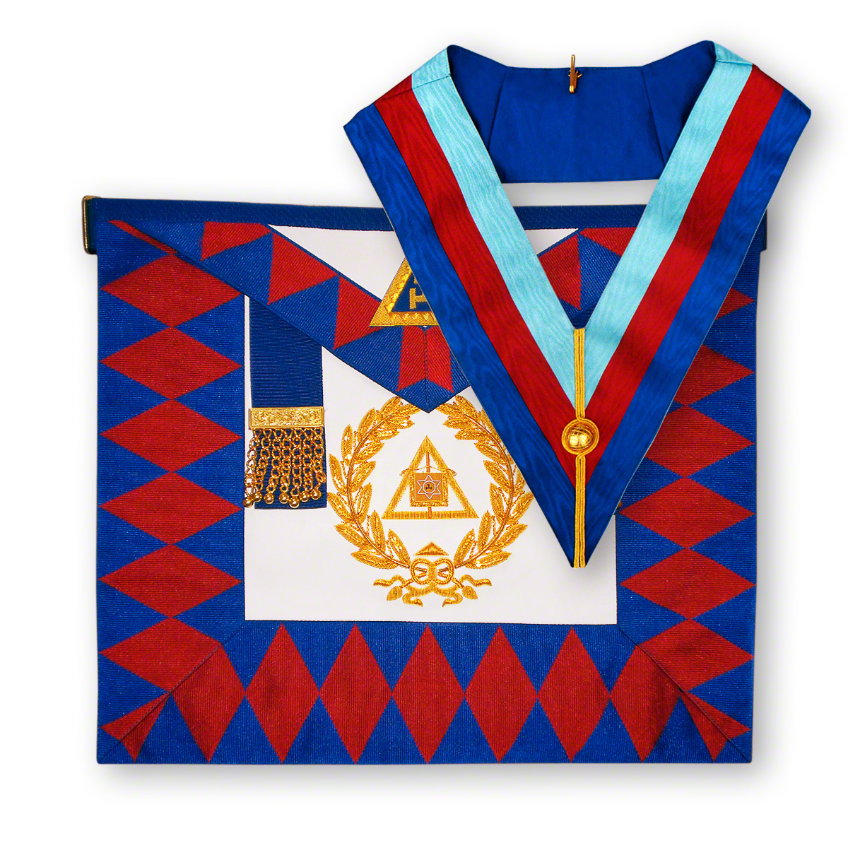Masonic Collection Limited brings you these two beautiful pieces of regalia in a set. This apron and collar set are made with a superior quality material to provide the best look and feel. The Apron is expertly hand embroidered that features a wreath and emblem of your rank in its design. The collar is also hand embroidered. The designs of the collar and apron, are sure to grab the attention of your fellow brothers and can spark a conversation.You can wear your new Royal Arch Grand Chapter Lambskin Apron & Collar in freemasonry functions, investiture ceremonies and lodge parties.