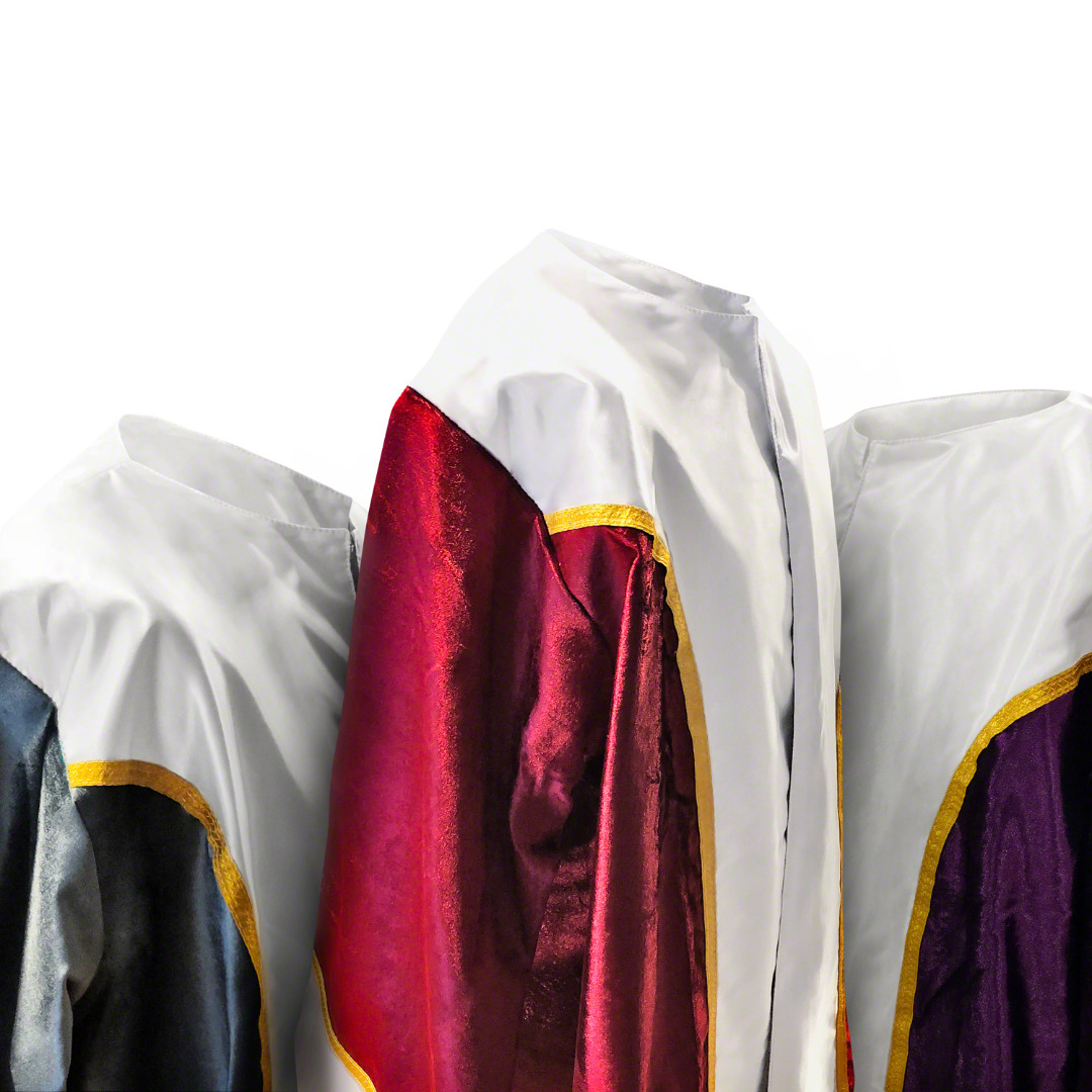 Masonic Collection Limited present a beautiful set of three Royal Arch Principal Robes. Each fantastic piece of the set is made with high quality velvet and comes with satin edging for that expertly done finish. The colours of the robes create a contrast with the clean white fabric that catches the eye; the set is made to impress. Each set consists of a 1st, 2nd & 3rd principal robe to save you time and money compared to buying each individually.